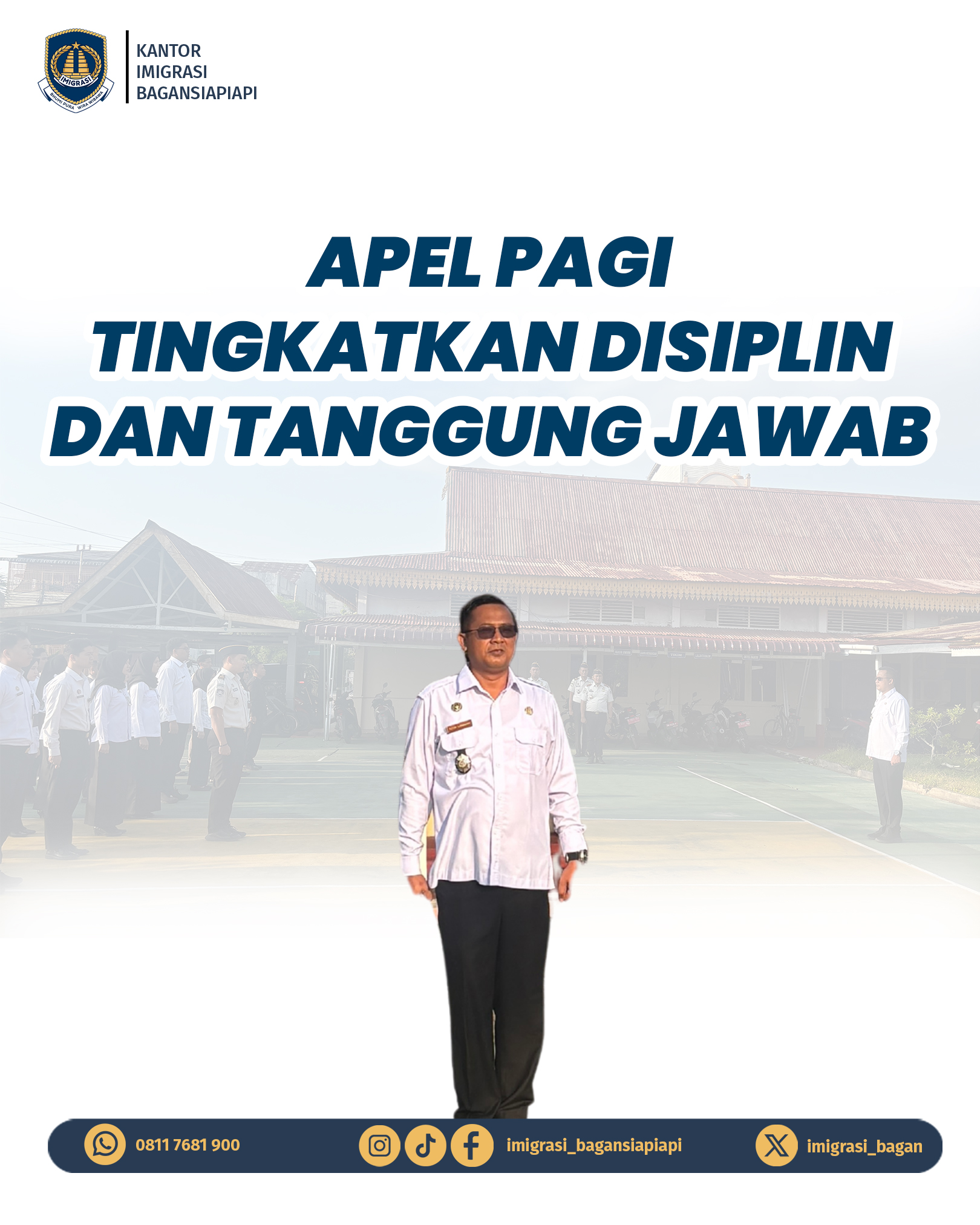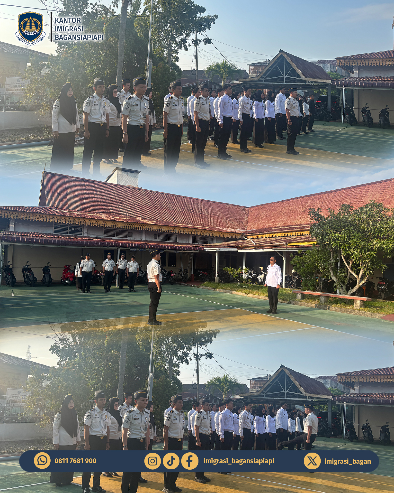 Senin pada tanggal 13 April 2026 Kantor Imigrasi Kelas II TPI Bagansiapiapi melaksanakan kegiatan apel pagi sebagai bentuk konsistensi dalam menanamkan nilai-nilai disiplin dan tanggung jawab bagi seluruh jajaran pegawai. Kegiatan ini menjadi momentum penting untuk memperkuat integritas, meningkatkan etos kerja, serta memastikan setiap tugas dan fungsi dijalankan dengan penuh rasa tanggung jawab.