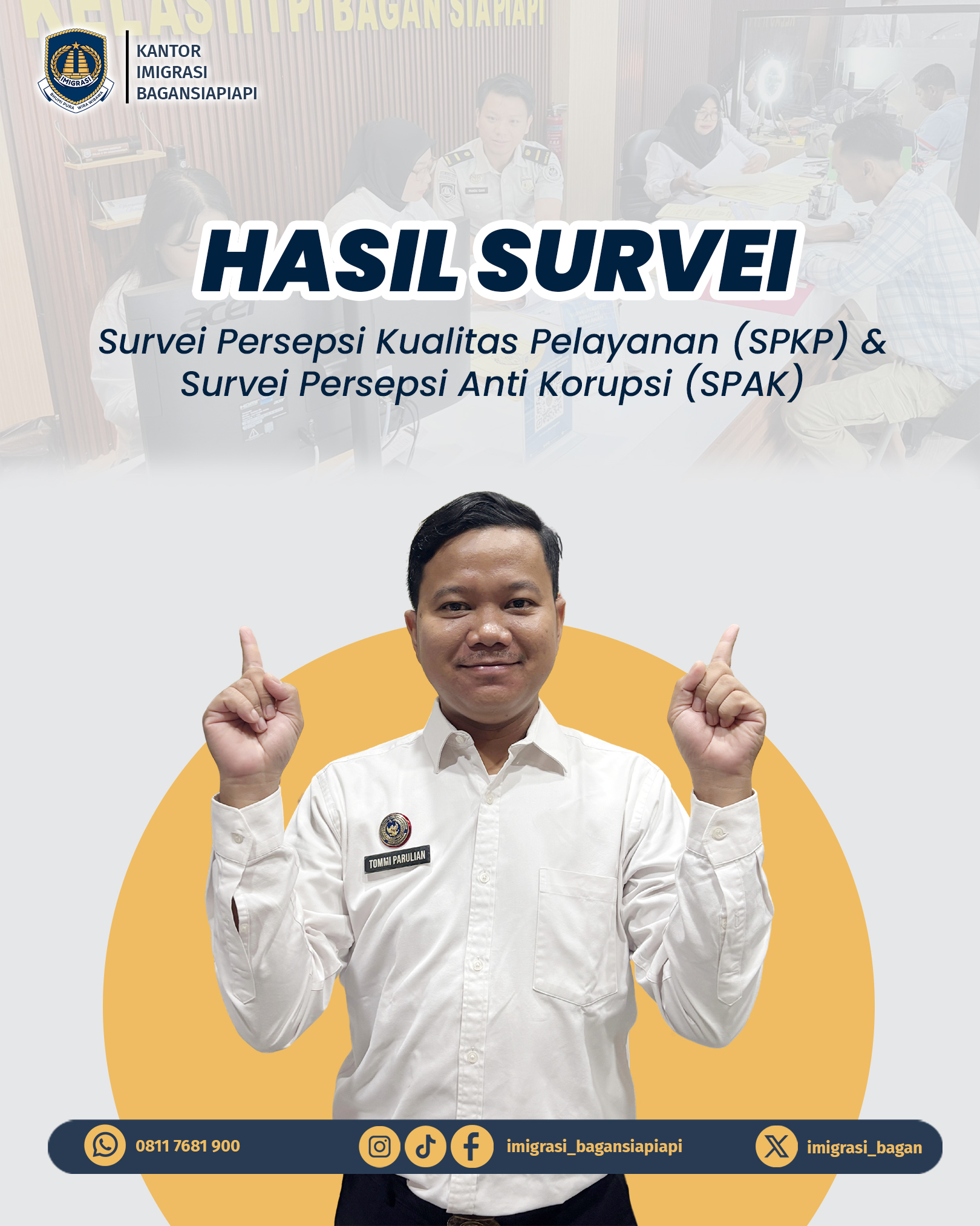 Kantor Imigrasi Kelas II TPI Bagansiapiapi terus berkomitmen memberikan pelayanan terbaik kepada masyarakat melalui penerapan SPKP (Survei Persepsi Kualitas Pelayanan) dan SPAK (Survei Persepsi Anti Korupsi).