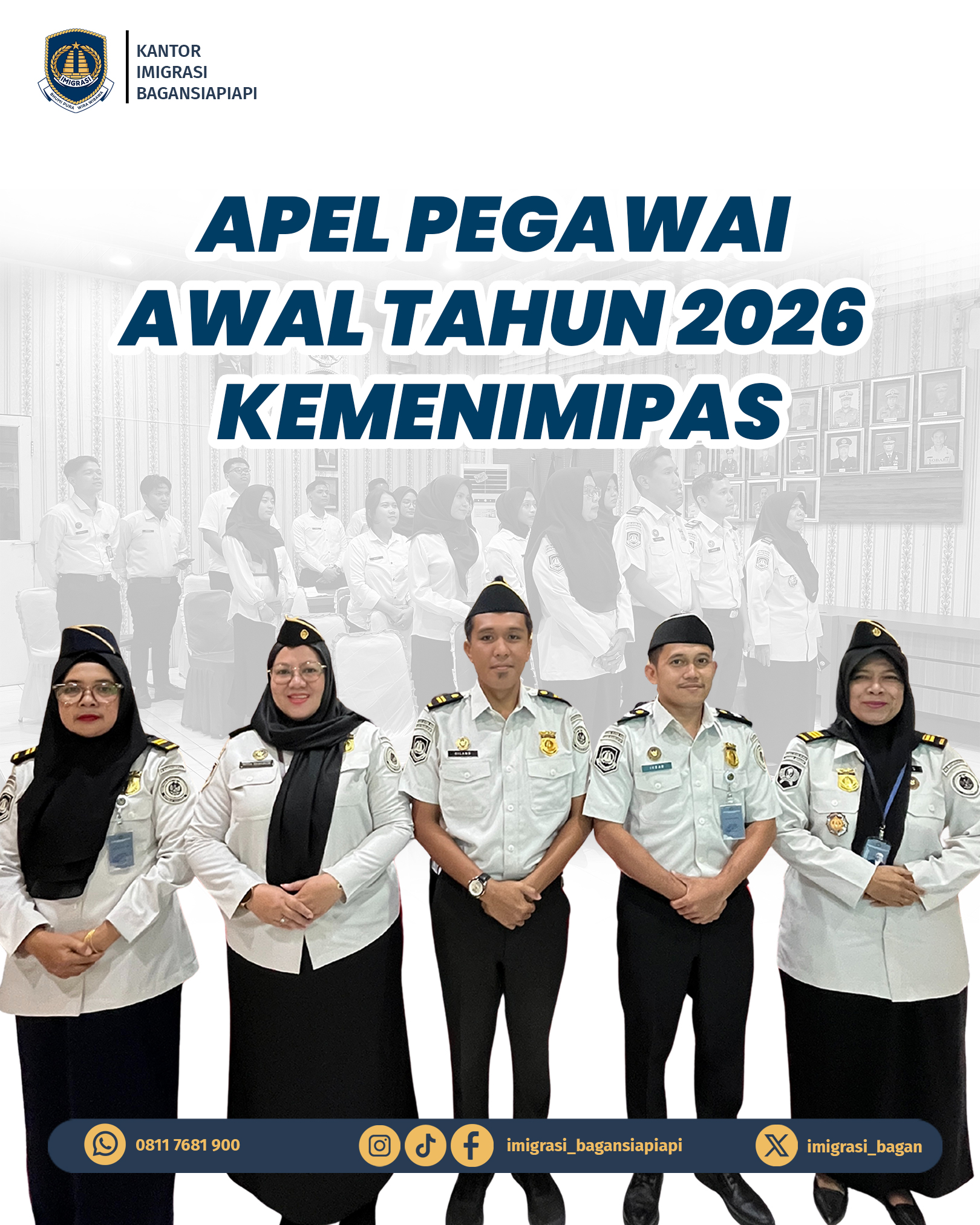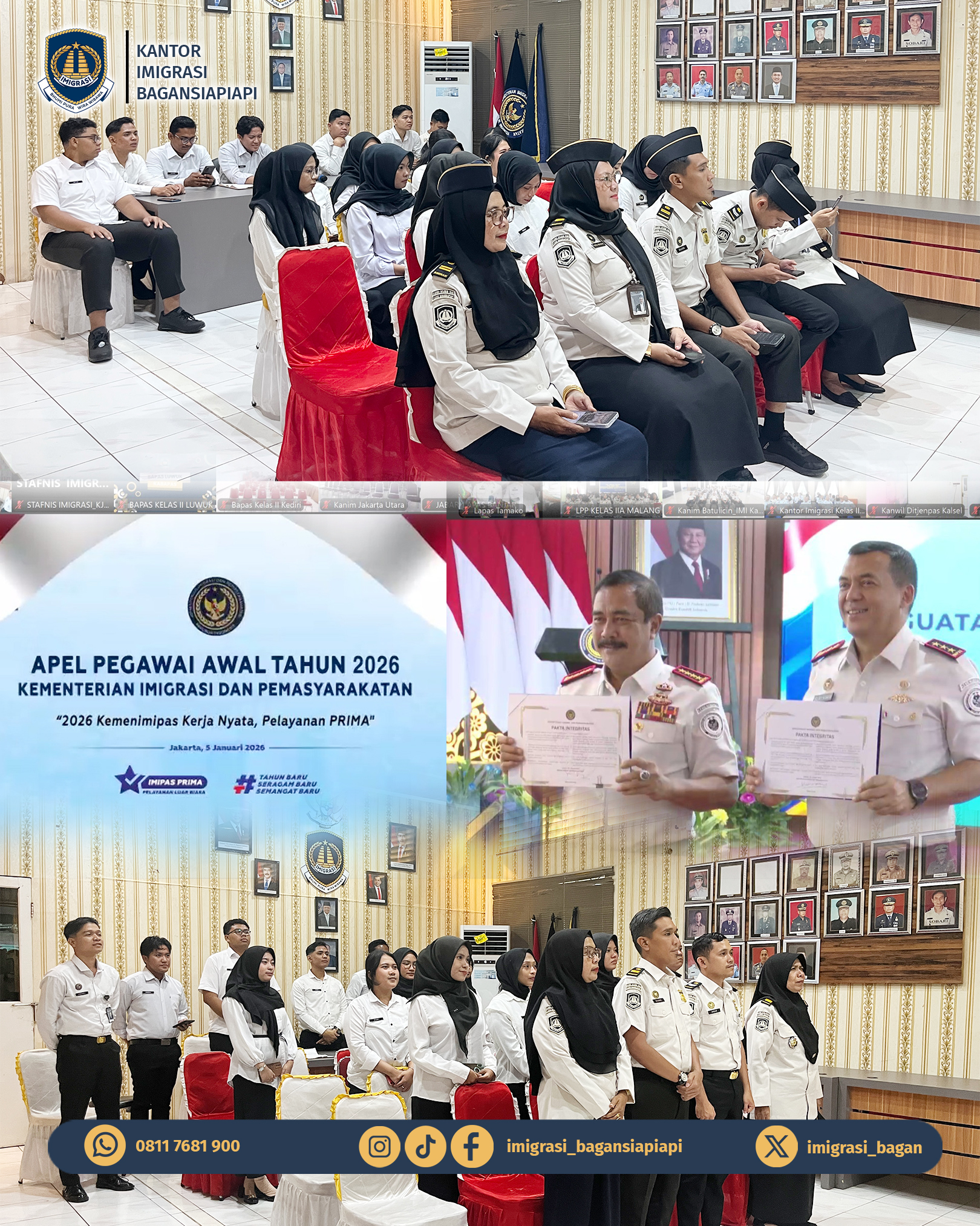 Senin (05/01), Kantor Imigrasi Kelas II TPI Bagansiapiapi melaksanakan Apel Pegawai Awal Tahun 2026 Kementerian Imigrasi dan Pemasyarakatn secara virtual melalui Zoom Meeting. Kegiatan ini menjadi langkah awal dalam mengawali pelaksanaan tugas dan fungsi Kementerian Imigrasi dan Pemasyarakatan di Tahun 2026, sekaligus sebagai momentum penguatan komitmen, integritas, serta semangat pengabdian seluruh pegawai.
