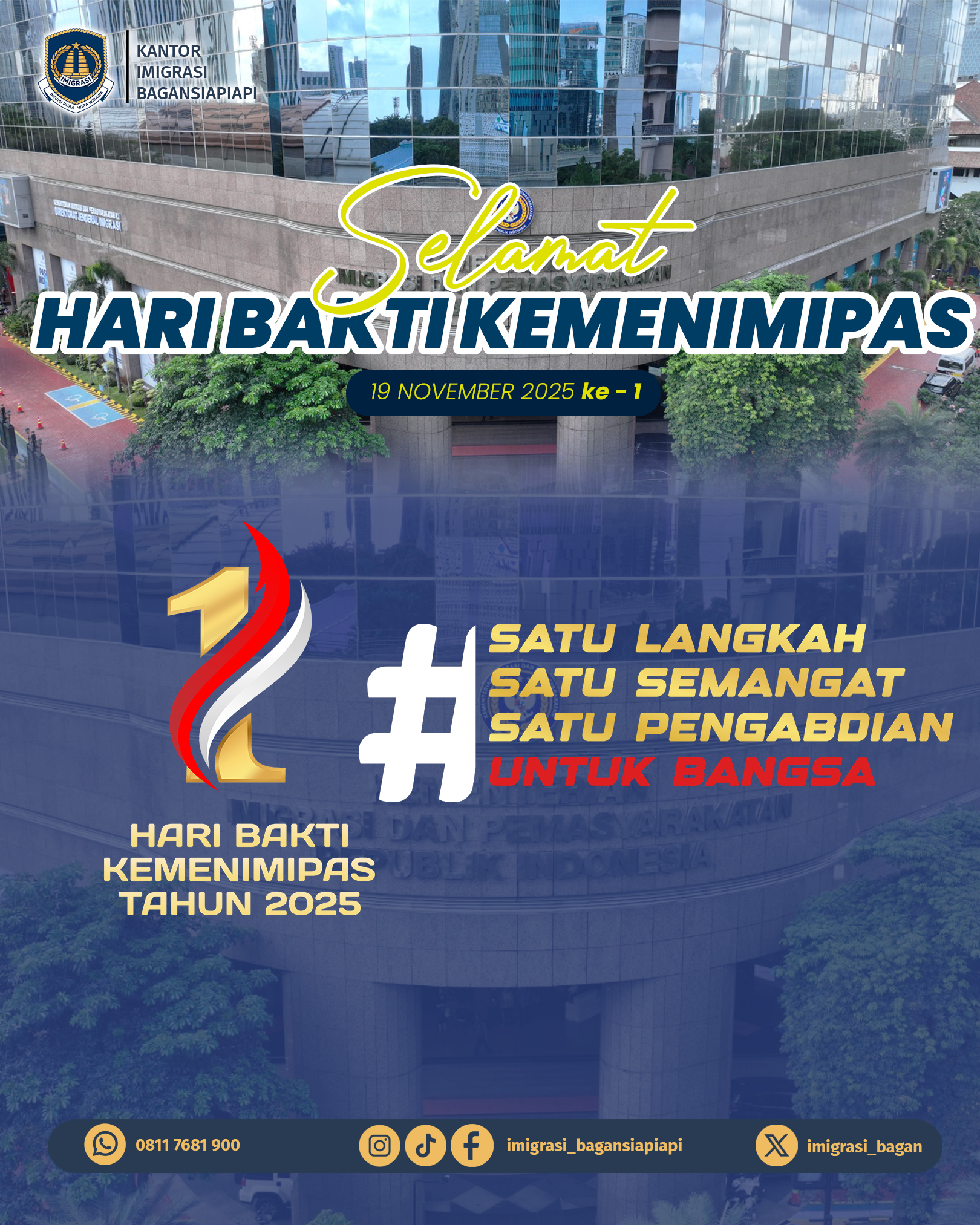 Kantor Imigrasi Kelas II TPI Bagansiapiapi mengucapkan Selamat Hari Bakti Kementerian Imigrasi dan Pemasyarakatan Ke - 1, 19 November 2025.